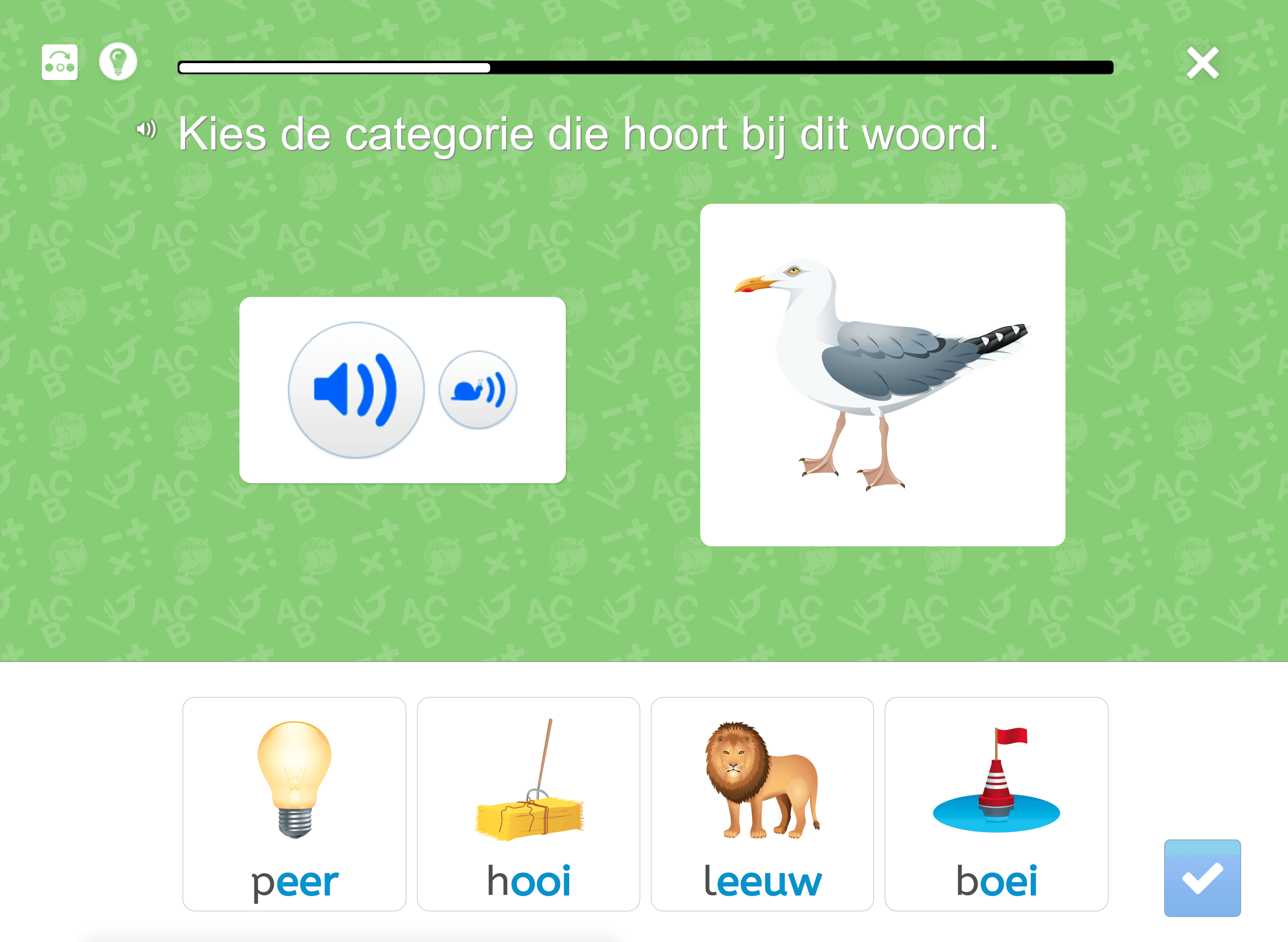 Voorbeeld van een opgave waarbij de leerling de juiste categorie moet kiezen bij een gesproken woord.